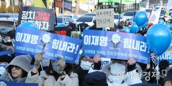 이재명 더불어민주당 대표가 대장동 개발 특혜 의혹 사건 관련 검찰 조사를 받은 28일 서울 서초구 중앙지검 앞에서 이 대표 지지단체가 응원 구호를 외치고 있다. 사진=김현민 기자 kimhyun81@