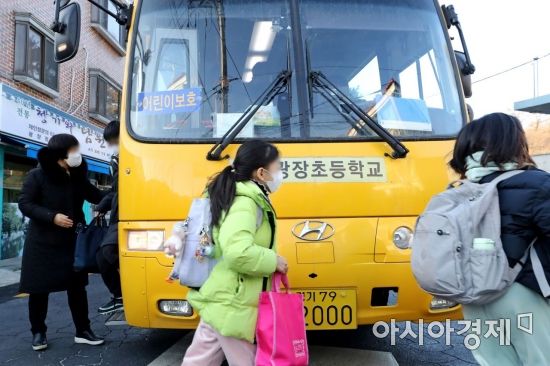 실내마스크 착용 의무가 해제된 30일 서울 광진구 광장초등학교 학생들이 통학버스에서 내리고 있다. 대부분 학생들은 마스크를 쓰고 등교했다. 정부는 이날 0시부터 대중교통과 의료시설, 감염취약시설 등 일부 시설을 제외한 실내에서 마스크 착용 의무를 권고로 조정했다. 사진=허영한 기자 younghan@