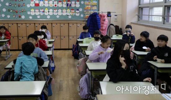 실내 마스크 의무 착용이 해제된 30일 오전 서울 광진구 광장동 광장초등학교에서 마스크를 쓴 학생들과 안 쓴 학생들이 한반에서 같이 수업 시작을 기다리고 있다. 사진=허영한 기자 younghan@