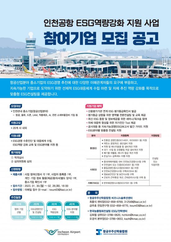 [아시아경제 유현석 기자] 인천국제공항공사는 30일부터 2월28일까지 항공산업분야 중소기업의 ESG 경영 활성화를 위한 ‘ESG 역량강화 지원사업(ESG100)’에 참여할 중소기업을 모집한다고 밝혔다.