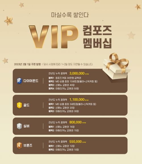 컴포즈커피는 단골들에게 혜택을 강화한 VIP 멤버십 캠페인을 지속하겠다고 31일 밝혔다.
