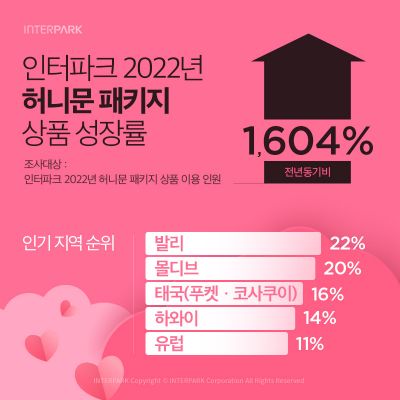 인터파크는 지난해 기준 회사 허니문 패키지 상품 이용 인원이 전년 대비 약 17배(1604%) 증가했다고 1일 밝혔다.