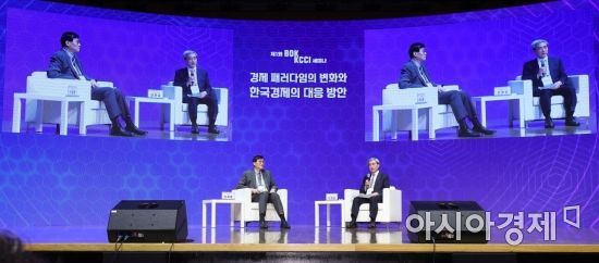 이창용 한국은행 총재와 신현송 BIS 경제보좌관 겸 조사국장이 1일 서울 중구 대한상공회의소에서 '경제 패러다임의 변화와 한국경제의 대응 방안'을 주제로 열린 제1회 한국은행-대한상의 공동세미나에서 대담을 하고 있다. 사진=김현민 기자 kimhyun81@
