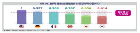 1일 전국경제인연합회는 ‘총요소생산성 현황과 경쟁력 비교’ 보고서에서 미국의 총요소생산성을 1이라고 할때 한국은 0.614라고 밝혔다. 한국의 총요소생산성이 미국의 61.4% 수준이라는 얘기다. 주요국별로는 미국(1), 독일(0.927), 프랑스(0.909), 영국(0.787), 일본(0.656), 한국(0.614) 순이다. 주요국(G5) 평균은 0.856다.