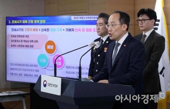 추경호 부총리 겸 기재부 장관이 2일 서울 종로구 정부서울청사에서 원희룡 국토부 장관과 한동훈 법무부 장관, 윤희근 경찰청장이 참석한 가운데 전세사기 대책 관련 합동브리핑을 하고 있다. 사진=김현민 기자 kimhyun81@