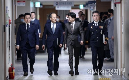 추경호 부총리 겸 기재부 장관과 원희룡 국토부 장관과 한동훈 법무부 장관, 윤희근 경찰청장이 전세사기 대책 관련 합동브리핑을 하기 위해 2일 서울 종로구 정부서울청사 브리핑실로 이동하고 있다. 사진=김현민 기자 kimhyun81@