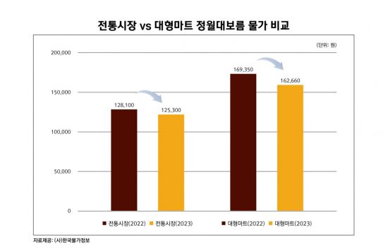 3일 가격조사기관인 한국물가정보에 따르면 정월대보름(5일)을 앞두고 주요 10개 품목의 가격을 조사한 결과 전통시장에서는 12만5300원, 대형마트에서는 16만2660원이 드는 것으로 조사됐다.