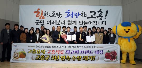 [고흥=아시아경제 호남취재본부 심정우 기자] 전남 고흥군(군수 공영민)은 고흥유자·석류가 중앙일보 포브스코리아 주관‘2023 소비자 선정 최고의 브랜드 대상’ 시상식에서 5년 연속 대상을 수상하는 쾌거를 거뒀다고 밝혔다.
