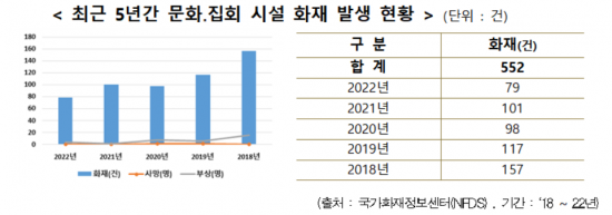 소방청 국가화재정보센터 자료에 따르면 최근 5년 간 문화 및 집회시설 화재는 총 552건이었다. 이에 소방청은 '2023년 화재안전조사 추진계획'을 수립하고 화재 등 각종 안전사고의 선제적 예방과 신속한 대응체계 확립을 위해 화재안전조사를 실시한다.