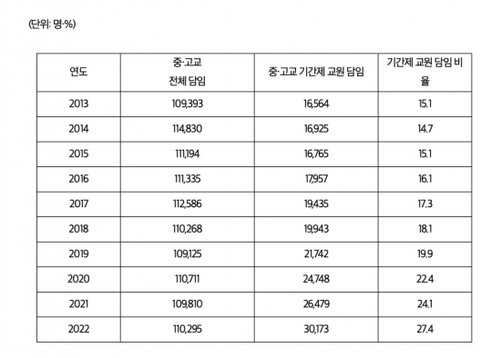 이 비율은 10년 전인 2013학년도만 해도 15.1%에 불과했지만, 2010년대 중반부터 기간제 교원의 비율이 크게 높아지고 있다. 최근 매년 2∼3%씩 높아지고 있어 올해는 30%에 육박할 것으로 보인다.