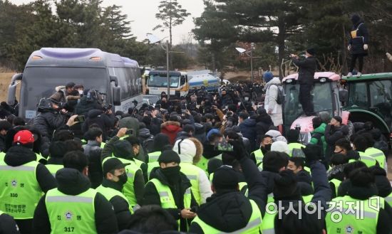 지난달 17일 오전 인천시 중구 스카이72 골프앤리조트 앞에서 강제집행을 시도하려는 인천지법 집행관실 관계자들과 이를 막으려는 임차인 측의 용업업체 직원들이 충돌하고 있다.사진=공항사진기자단