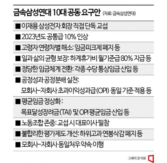 삼성 12개 계열사 노조로 구성된 한국노총 금속노련 삼성그룹노조연대(금속삼성연대)는 7일 오전 기자회견을 열고 올해 기본급 10% 인상 등 10대 공동요구안을 발표했다. 지난해 실질소득 감소분이 5%라는 자체 집계 자료도 발표했다. 올해 물가상승률 5.9%에 경제성장률 1.8%를 고려해 임금 10% 인상을 요구했다.