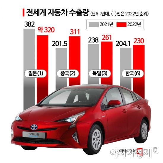 일본의 자동차 수출은 1위를 유지하고 있다. 하지만 중국의 성장세가 무섭다. 지난해 1~11월 일본 자동차 수출대수는 약 320만대다. 이는 2021년 382만대 수출보다 줄어든 수치다. 반면 중국은 전년 대비 54.4% 증가한 311만대로 독일(261만대)을 제치고 자동차 수출대수 2위를 차지했다. 한국은 230만대를 기록해 전년 대비 13.3% 증가했다.