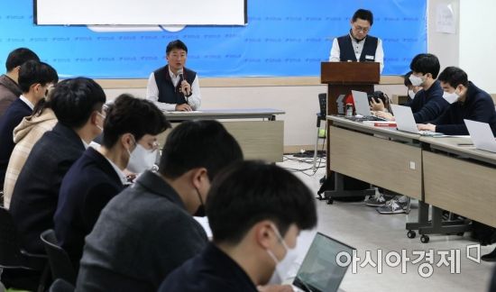 양경수 민주노총 위원장이 8일 서울 중구 민주노총 서울 사무실에서 신년 기자회견을 하고 있다. 사진=윤동주 기자 doso7@