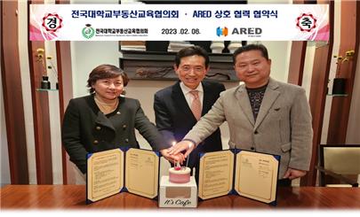 장대섭 전국대학교부동산교육협의회 회장(오른쪽)과 박은경·정경환 (주)아레드 ARED 대표가 전략적 상호협력을 위한 협약 체결 후 기념 사진을 촬영하고 있다.[사진 제공=전국대학교부동산교육협의회]