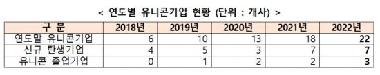2021년 말 18개 사인 국내 유니콘 기업은 지난해 7개 사가 추가되고 3개 사는 상장, 인수·합병으로 졸업하면서 2022년 말 기준 22개 사가 됐다. 이는 국내 유니콘 기업을 집계한 이래 연도 말 기준으로 가장 많은 숫자다.