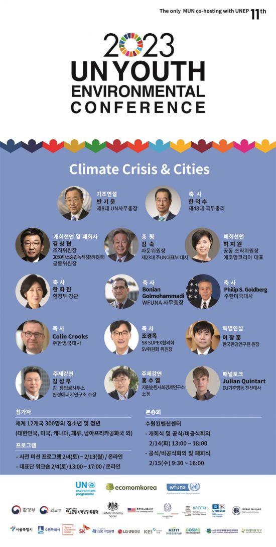 UN청소년환경총회는 청소년의 시각에서 지구의 환경위기를 극복할 해법을 도출하는 교육 프로그램이다. 올해는 우리나라를 비롯해 캐나다ㆍ미국ㆍ 페루ㆍ에콰도르ㆍ남아프리카공화국ㆍ소말리아 등 12개국에서 300명의 중ㆍ고등학생, 대학생 의장단이 참여한다. 대면ㆍ비대면 병행 방식으로 열린다.