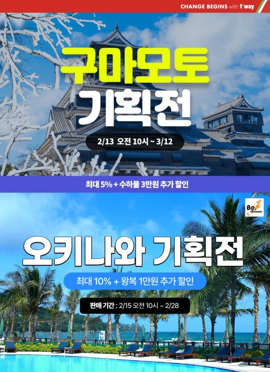 티웨이항공 관계자는 “따뜻한 날씨와 다양한 즐길 거리가 있는 구마모토, 오키나와 여행을 기획전 혜택과 함께 준비해 볼 것을 추천한다”라며 “티웨이항공의 편리한 매일 운항 스케줄로 먼저 다가온 일본의 봄을 느껴보시기를 바란다”라고 전했다.