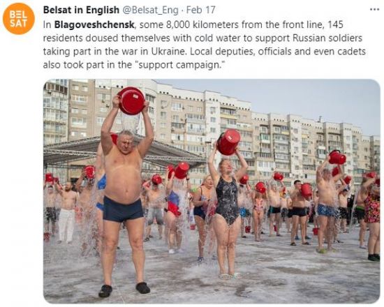 러시아의 한 지역 주민 150명이 영하 22도의 강추위 속에서도 수영복 차림으로 한데 모여 '전쟁 지지' 행사를 벌였다.
