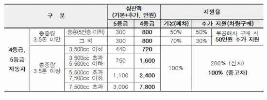 조기폐차 지원 대상자로 선정되면 상한액 내에서 폐차 지원금과 차량구매 추가 지원금을 받을 수 있다. 4등급의 경우 3.5톤 미만 차량은 최대 800만 원, 3.5톤 이상은 7500cc 초과 시 최대 7800만 원까지 지원된다.
