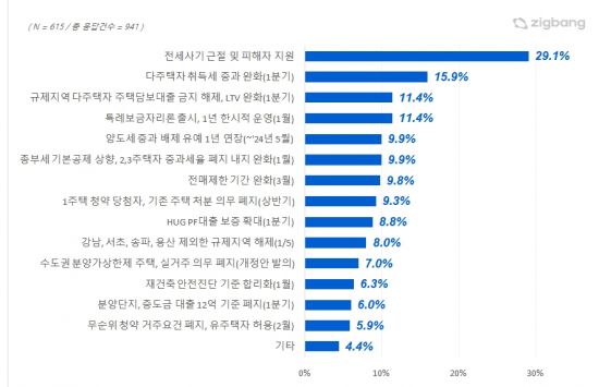 우선 올해 이미 시행되고 있거나 준비 중인 정책들 가운데 가장 관심이 크거나 기대되는 것이 무엇인지를 묻는 말에 '전세사기 근절 및 피해자 지원'이 29.1%로 가장 많이 응답됐다. 이어 △다주택자 취득세 중과 완화(15.9%) △규제지역 다주택자 주택담보대출 금지 해제, △주택담보대출(LTV) 완화·특례보금자리론 출시 1년 한시적 운영(11.4%) △양도세 중과 배제 유예 1년 연장(9.9%)·종부세 기본공제 상향, 2·3주택 중과세율 폐지 내지 완화(9.9%) △전매제한 기간 완화(9.8%) △1주택 청약 당첨자, 기존 주택 처분 의무 폐지 등의 순서로 나타났다.