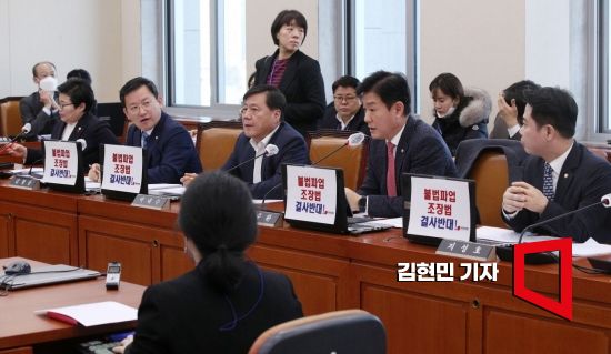 21일 서울 여의도 국회에서 열린 환경노동위원회 전체회의에서 여당 의원들이 자리에 노조법 개정안을 반대하는 팻말이 붙어 있다. 더불어민주당은 이번 회의에서 노동조합법 2·3조 개정안 처리를 예고했다. 사진=김현민 기자 kimhyun81@