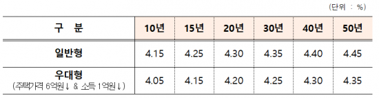 이 경우 대면과 비대면(인터넷 전자 약정) 신청의 금리가 동일하게 적용돼 일반형의 경우 연 4.15%(10년)부터 4.45%(50년), 우대형의 경우 연 4.05%(10년)부터 4.35%(50년)로 실질적으로 금리가 0.1% 포인트가 인하되는 혜택을 누릴 수 있다.