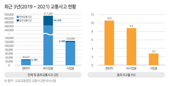 최근 3년간(2019~2021년) 렌터카 음주 사고 비중은 전체 렌터카 교통사고의 10.5%로, 사업용자동차(3.0%)의 3.5배, 비사업용자동차(8.5%)의 1.2배로 나타났다.