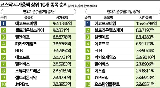 28일 한국거래소에 따르면 코스닥 상위 10개 종목의 시가총액은 57조7695억원(26일 기준)으로 집계됐다. 올해 1월2일 종가 기준 44조5346억원 대비 29.7% 증가한 수준이다.