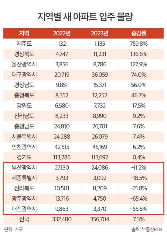 부동산R114에 따르면 올해 전국에 총 35만 6,704가구가 입주 예정인 것으로 나타났다. 지역별로는 경기도가 11만 3,692가구로 가장 많은 물량이 예정돼 있으며 인천(45,169가구), 대구(36,059가구), 충남(26,701가구), 서울(26,079가구) 등이 뒤를 잇는다. 가장 적은 지역은 1,135가구가 예정된 제주도이며 세종, 대전, 광주 등도 입주 예정 물량이 5,000가구 미만이다.