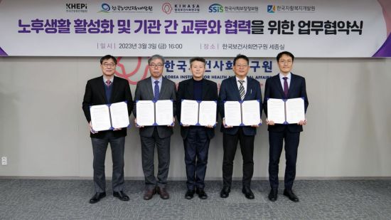 한국건강증진개발원과 한국노인인력개발원, 한국보건사회연구원, 한국사회보장정보원, 한국자활복지개발원은 '노후생활 활성화'를 위한 다자간 업무협약을 체결했다고 6일 밝혔다.