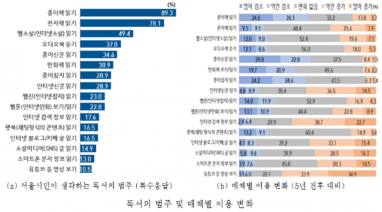 서울기술연구원이 서울시민 1037명을 대상으로 설문조사를 실시한 결과, 시민들은 ‘디지털 정보’까지 독서로 인식하고 있으며, 5년 전 대비 ‘종이책’ 이용은 50.7% 감소한 반면, ‘유튜브 등을 활용한 영상정보 이용’은 68.8%, ‘인터넷 검색을 통한 정보읽기’는 61.4% 증가한 것으로 나타났다고 7일 밝혔다.