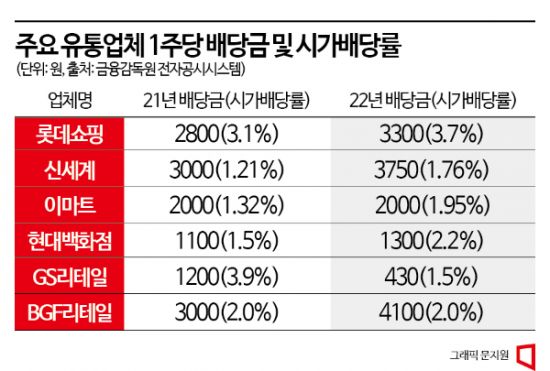 롯데쇼핑 외에도 주요 유통업체들은 지난해 최대 실적 등을 토대로 배당금 상향 정책을 시행하며 주주가치 제고에 나서는 모습이다. 신세계는 2021년 보통주 1주당 3000원이었던 배당금을 지난해 3750원으로 25.0% 늘렸고, 현대백화점도 1100원에서 1300원으로 18.2% 인상했다. 신세계백화점은 2021년에 이어 지난해에도 2년 연속 매출과 영업이익 모두 사상 최대치를 기록했고, 현대백화점도 지난해 전년 대비 40% 이상 증가한 매출 5조141억원으로 역대 최대 실적을 거뒀다.