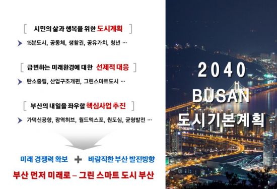 이번 계획에는 “부산 먼저 미래로-그린스마트 도시 부산”이라는 도시미래상을 설정하고, 지역 균형발전을 위한 도시공간구조 재편을 담았다.