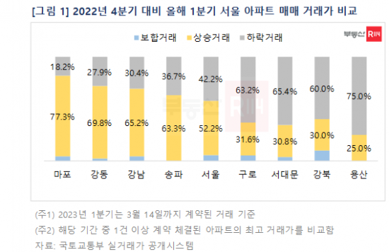 16일 부동산R114에 따르면 올 들어 거래된 서울 아파트 531건 가운데 직전 분기인 지난해 4분기 대비 상승한 거래는 277건으로 52.5%의 비중을 차지했다. 하락 거래는 224건(42.2%)이었고 가격 변동이 없었던 거래는 30건(5.6%)으로 조사됐다.