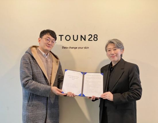 [17일 경기도 판교 톤28 본사에서 진행된 전략적 제휴 협약식에서 윤동현 주식회사 케이코스메몰 대표이사(왼쪽), 정마리아 주식회사 톤28 대표이사가 협약식 이후 기념 촬영하고 있다.(사진=KCM 제공)]