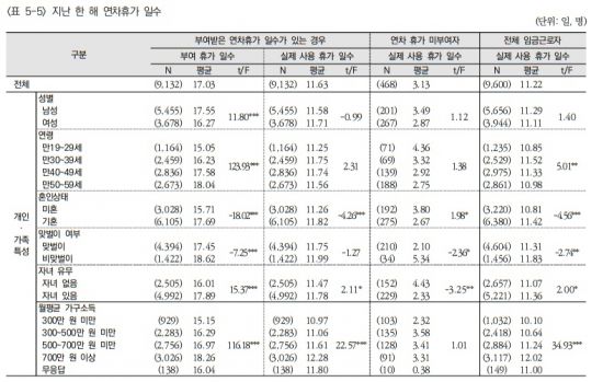 대부분 입사 후 시간이 지날수록 자연스레 연차 휴가 일수는 늘어났지만 연령대에 따른 휴가 사용 일수는 큰 차이가 없었다. 이뿐 아니라 취업근로자 대부분은 연차 휴가를 부여받고 있었지만 468명은 따로 정해진 연차 휴가가 없었다. 이 경우 연평균 3.13일만 휴가를 사용했다.