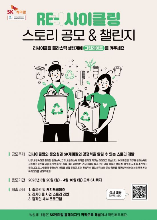 SK케미칼은 리사이클링 스토리 대학생 공모전 '리사이클링 생태계에 그린라이트'(이하 공모전)를 개최한다고 20일 밝혔다.