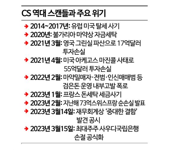 이후 탈세와 마약상 돈세탁, 세금 사기 등 일련의 부패 스캔들이 드러나면서, 비밀주의를 자산으로 한 은행의 명성을 맥없이 무너뜨렸다. 경영진 비리로 회전문 인사가 이어지면서 경영 난맥상도 이어졌다. 수익과 외형이 감소하는 악순환 사이클이 수년간 이어졌다. 이 영향으로 지난해 4분기에만 1100억스위스프랑(약 155조8500억원) 이상의 고객 자금이 빠져나갔다. 지난해 한 해 동안 73억스위스프랑(약 10조3400억원)이라는 사상 최악의 순손실을 내기도 했다.