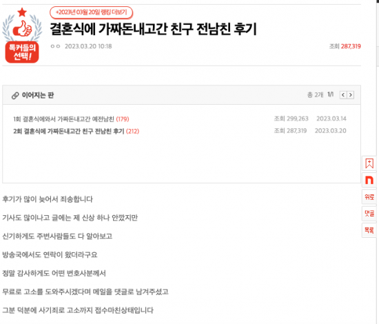 당시 A 씨는 "초대 못 받은 친구 하나가 5년 전에 사귀었던 전 남자 친구를 데려와서 어린이 지폐 장난감 돈을 봉투에 담아서 내고 식권 2장까지 받아 가서 밥 먹고 갔다더라"고 했다.