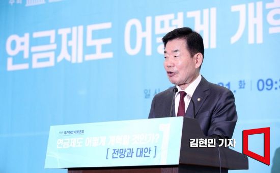 김진표 국회의장이 21일 서울 여의도 국회의원회관에서 열린 제1회 국가현안 대토론회 '연금제도 어떻게 개혁할 것인가'에서 인사말을 하고 있다. 사진=김현민 기자 kimhyun81@