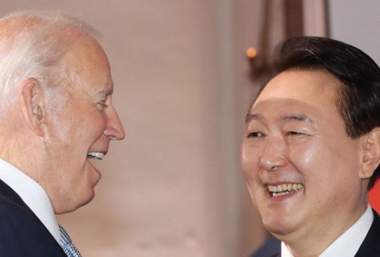 윤석열 대통령과 조 바이든 미국 대통령이 2022년 9월 21일(현지시간) 미국 뉴욕 한 빌딩에서 열린 글로벌펀드 제7차 재정공약회의를 마친 뒤 대화를 나누고 있다. [이미지출처=연합뉴스]