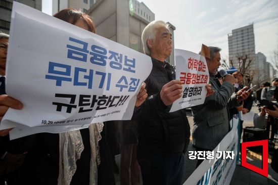 22일 서울 마포구 서부지검 정문 앞에서 10.29이태원참사유가족협의회 및 시민대책회의 소속 관계자들이 이태원참사 희생자 및 생존자 금융정보조회 규탄 기자회견을 하고 있다.