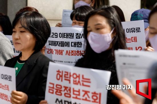 22일 서울 마포구 서부지검 정문 앞에서 10.29이태원참사유가족협의회 및 시민대책회의 소속 관계자들이 이태원참사 희생자 및 생존자 금융정보조회 규탄 기자회견을 하고 있다.