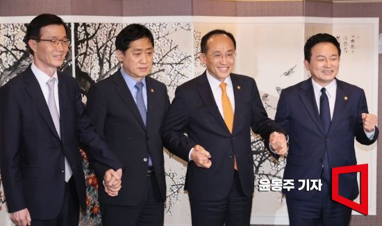 추경호 경제부총리와 원희룡 국토교통부 장관, 김주현 금융위원장, 방문규 국무조정실장이 22일 서울 종로구 정부서울청사에서 열린 부동산관계장관회의에 참석, 포즈를 취하고 있다. 사진=윤동주 기자 doso7@