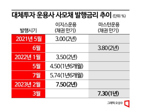 23일 투자은행(IB) 업계에 따르면 마스턴투자운용은 전날 케이프투자증권 주관으로 150억원 규모의 사모채를 발행했다. 만기는 1년으로 발행 금리는 7.3%다. 2021년 신한투자증권 주관으로 2년 만기 사모채를 3.8%에 발행한 것에 비하면 2년새 금리가 무려 2배 수준으로 올랐다.