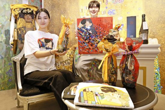와인과 함께 '이상봉×클림트 컬렉션'을 모티브로 한 디자인의 티셔츠, 스카프, 보자기 형태의 와인 패키지 등 다양한 패브릭 상품을 선보인다.