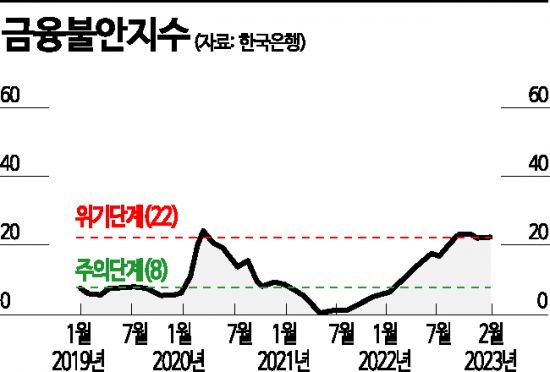 지난해 레고랜드 사태로 '위기' 단계까지 치솟았던 우리나라 금융불안지수(FSI)가 최근 대내외 불확실성이 커지면서 위기 수준을 이어가고 있다. 이달 미국 실리콘밸리은행(SVB)·스위스 투자은행(IB) 크레디스위스(CS) 충격이 글로벌 금융시장을 강타한 가운데 향후 대외 불안이 커지면 최근 금리인상 등으로 높아진 FSI가 급등할 수 있다는 분석이 나온다.