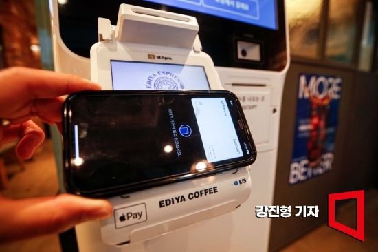 23일 서울 한 커피전문점에서 고객이 애플페이를 이용해 결제를 하고 있다.
