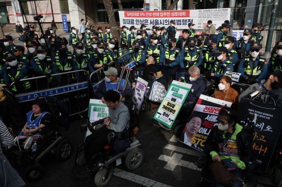 23일 전장연은 이날 오전 8시부터 서울 지하철 1호선 시청역에서 지하철 지연 시위에 나섰다. 지난 1월20일 서울 지하철 삼각지역에서 시위를 벌인 이후 62일 만이다. 이들은 지하철 탑승을 시도했지만 경찰과 지하철 보안관의 저지로 막혔다. 다만 출근길에 시민들과 경찰, 취재진 등이 엉키면서 지하철 운행은 2~3분가량 지연됐다.